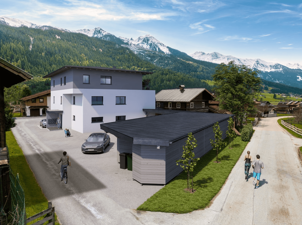 Jede Einheit ist mit einer Terrasse oder einem privaten Garten ausgestattet. Ergänzend stehen den Bewohner:innen ein Carport mit PKW-Abstellplätzen, Abstellräume im Kellergeschoss, Fahrrad- und Kinderwagenräume sowie Besucherparkplätze und ein Kinderspielplatz zur Verfügung.